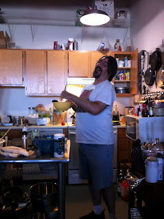 Sour cream quickly acquired, Bri adds it to the liquid ingredients and then adds those to the dry ingredients of the shortcake and all along he's dancing as he stirs batter to the beat of the retro sounds of The Church. (This might have something to do with the Great Shortcake Disaster of 2012 which at this point we are unknowingly hurtling toward.)