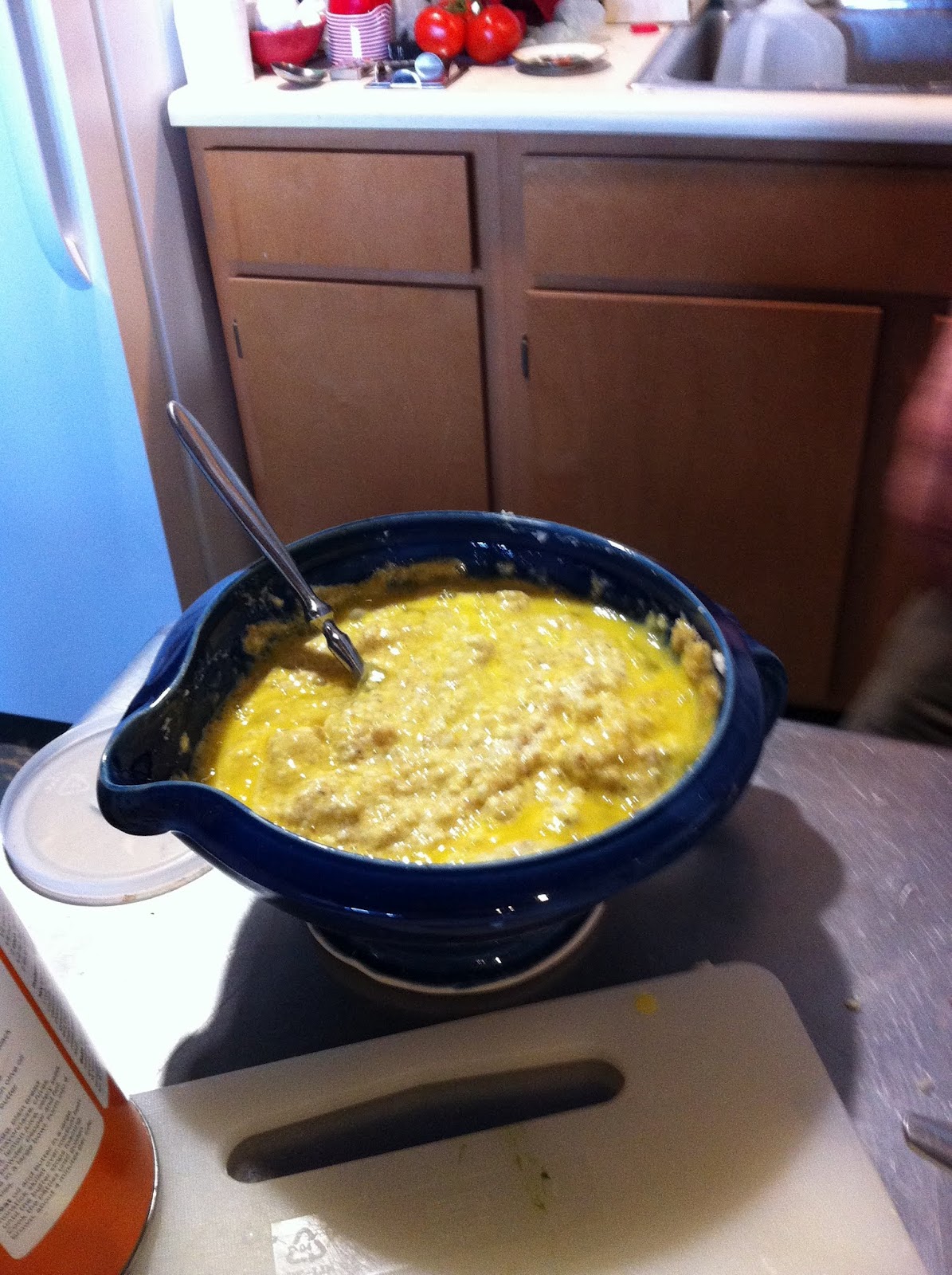 Meanwhile, Alex and Jim are hard at work on the main course. They add sundried tomatoes, panko bread crumbs and some Romano cheese to the ricotta and then they dredge the cheese in egg and flour to fry it. The ricotta is actually thick enough to allow this. It almost resembles tofu in texture. Hmm, well, not that you would agree with that idea from seeing this picture. I'm going to ask Alex to chime in in the comments with how exactly he managed to fry that soupy looking cheese...