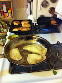 The empanadas are fried, the noodles come out of the fridge, and it's time to plate the food up and eat. Call it: Time of Food, 8:57pm.