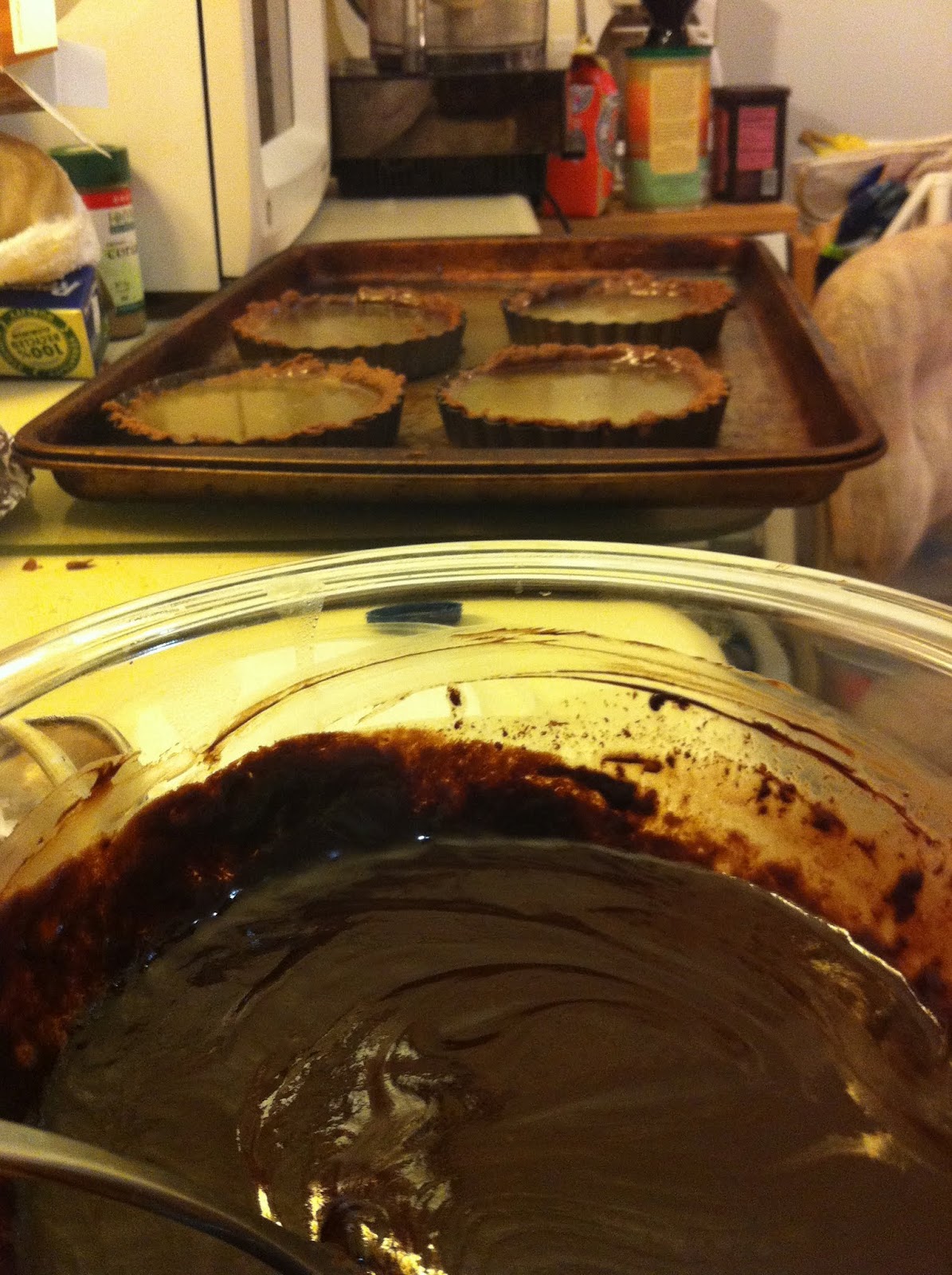 Brian made the whole thing while we were distracted by the phyllo dough process. After the dough chilled for an hour, Bri divided it into four pieces, rolled each out and spread it into a tart pan. Then the crust was baked for an hour. Meanwhile, Bri began the laborious stirring of the caramel in a saucepan- that seemed to take an hour, too. The tarts needed to cool for a long time after they baked, then the caramel was poured in and they were placed in the refrigerator. Too soon, we took them out again to pour the chocolate on top. That didn't work out too well, so back they went to chill some more and we went off to eat dinner. Another hour later, we spread the chocolate and chilled it for another half hour or so. That damn dessert took forever to make. When we finally did eat it, it was STILL too liquidy.