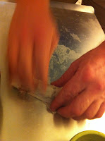 Brian had a brief panic attack just before Jim and Alex arrived when he realized that the dessert he chose (getting the idea from Aquitaine-Chestnut Hill) has 3 different chilling times, totaling 2 hours, overall. He moved around the kitchen like a whirling dervish getting the dough ready as fast as possible. It's about half way through the first hour of chilling and it looks just like gingerbread, but Bri tells me he is making a chocolate tart crust. This dessert has a fairly simple but -as it turned out- delicious chocolate/flour/egg crust. It also involves making your own caramel, which you do by melting sugar in corn syrup and water and stirring for a really long time. Then, on top of the caramel layer, there is a thin spread of a chocolate cream sauce, which is easy to make: you just melt the chocolate in the microwave and add cream. In the Restaurant Week menu, this dessert is described as coming with "Nutella powder" and espresso ice cream, but we skipped those as being too over the top.Moroccan Cigars