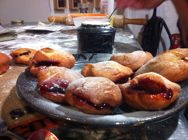 So we resort to conducting a scientific experiment: should we make the dough thinner, or put a hole in the middle? It turned out that making the dough thinner worked out perfectly, so we abandoned the other branch of that science experiment . We have some delicious raspberry jam in the house, so Jim is now artificially injaminating the doughnuts.