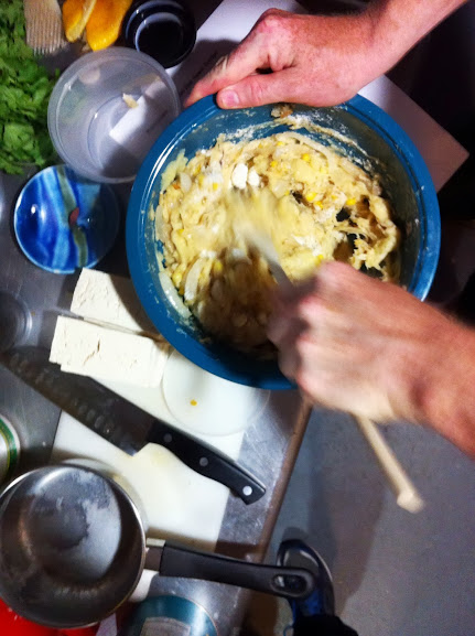 Paprika, oregano, garlic... all of these are going into the mashed potatoes, while meanwhile the onion/corn etc mixture is done frying and Jim is adding it all together.